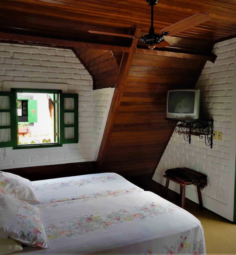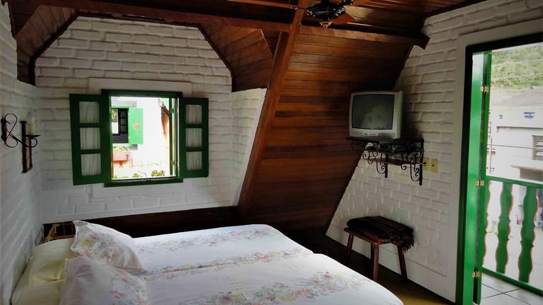 No andar superior: suíte com ventilador de teto, TV e sacada - com vista para as montanhas.